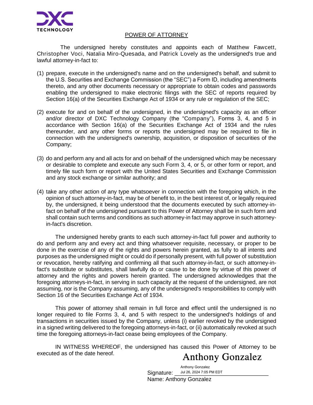 POWER OF ATTORNEY The undersigned hereby constitutes and appoints each of Matthew Fawcett, Christopher Voci, Natalia Miro-Quesada, and Patrick Lovely as the undersigned's true and lawful attorney-in-fact to: (1) prepare, execute in the undersigned's name and on the undersigned's behalf, and submit to the U.S. Securities and Exchange Commission (the “SEC”) a Form ID, including amendments thereto, and any other documents necessary or appropriate to obtain codes and passwords enabling the undersigned to make electronic filings with the SEC of reports required by Section 16(a) of the Securities Exchange Act of 1934 or any rule or regulation of the SEC; (2) execute for and on behalf of the undersigned, in the undersigned's capacity as an officer and/or director of DXC Technology Company (the “Company”), Forms 3, 4, and 5 in accordance with Section 16(a) of the Securities Exchange Act of 1934 and the rules thereunder, and any other forms or reports the undersigned may be required to file in connection with the undersigned's ownership, acquisition, or disposition of securities of the Company; (3) do and perform any and all acts for and on behalf of the undersigned which may be necessary or desirable to complete and execute any such Form 3, 4, or 5, or other form or report, and timely file such form or report with the United States Securities and Exchange Commission and any stock exchange or similar authority; and (4) take any other action of any type whatsoever in connection with the foregoing which, in the opinion of such attorney-in-fact, may be of benefit to, in the best interest of, or legally required by, the undersigned, it being understood that the documents executed by such attorney-in- fact on behalf of the undersigned pursuant to this Power of Attorney shall be in such form and shall contain such terms and conditions as such attorney-in fact may approve in such attorney- in-fact's discretion. The undersigned hereby grants to each such attorney-in-fact full power and authority to do and perform any and every act and thing whatsoever requisite, necessary, or proper to be done in the exercise of any of the rights and powers herein granted, as fully to all intents and purposes as the undersigned might or could do if personally present, with full power of substitution or revocation, hereby ratifying and confirming all that such attorney-in-fact, or such attorney-in- fact's substitute or substitutes, shall lawfully do or cause to be done by virtue of this power of attorney and the rights and powers herein granted. The undersigned acknowledges that the foregoing attorneys-in-fact, in serving in such capacity at the request of the undersigned, are not assuming, nor is the Company assuming, any of the undersigned's responsibilities to comply with Section 16 of the Securities Exchange Act of 1934. This power of attorney shall remain in full force and effect until the undersigned is no longer required to file Forms 3, 4, and 5 with respect to the undersigned's holdings of and transactions in securities issued by the Company, unless (i) earlier revoked by the undersigned in a signed writing delivered to the foregoing attorneys-in-fact, or (ii) automatically revoked at such time the foregoing attorneys-in-fact cease being employees of the Company. IN WITNESS WHEREOF, the undersigned has caused this Power of Attorney to be executed as of the date hereof. Signature: ______________________________ Name: Anthony Gonzalez Anthony Gonzalez Jul 26, 2024 7:05 PM EDT